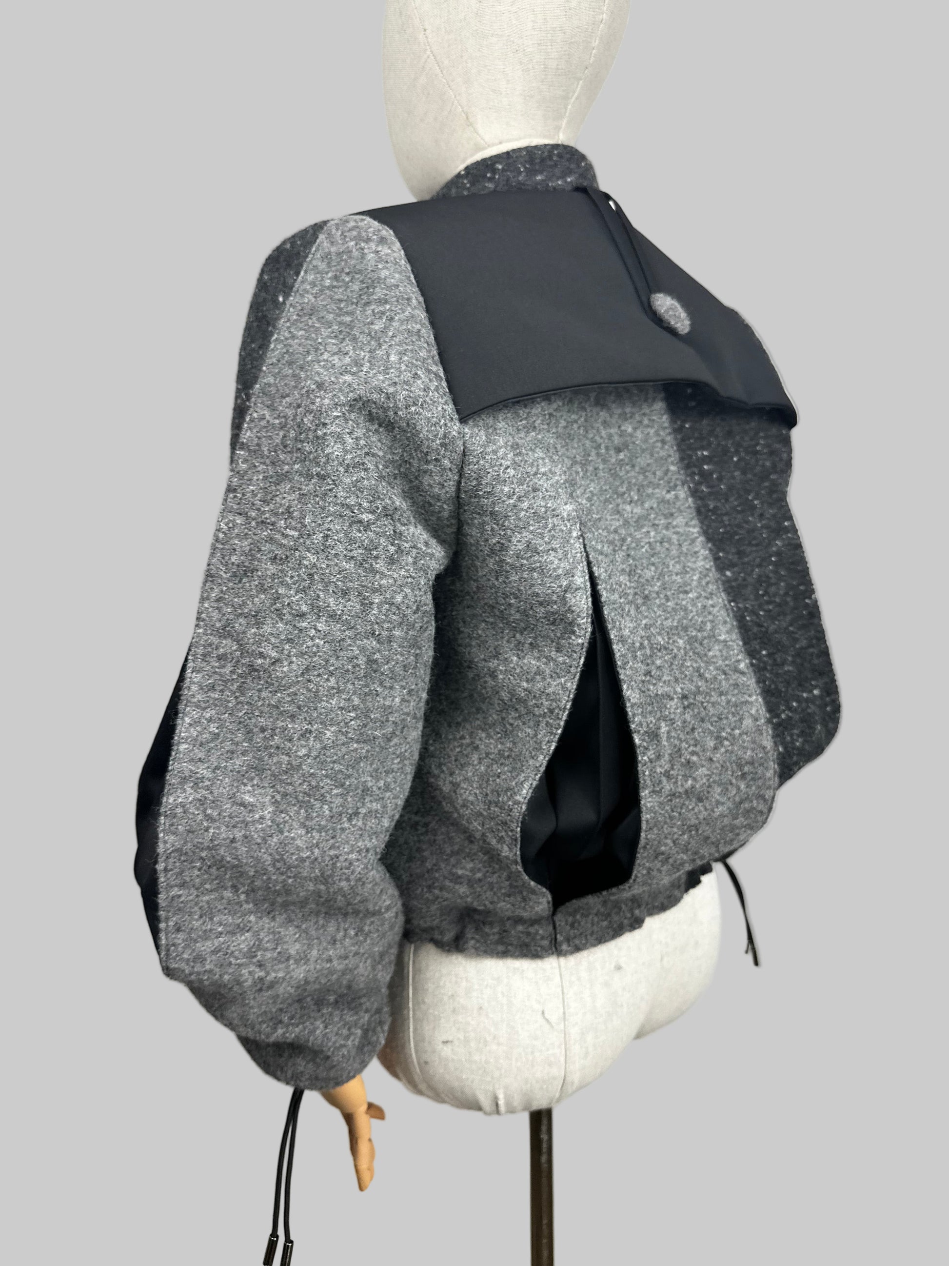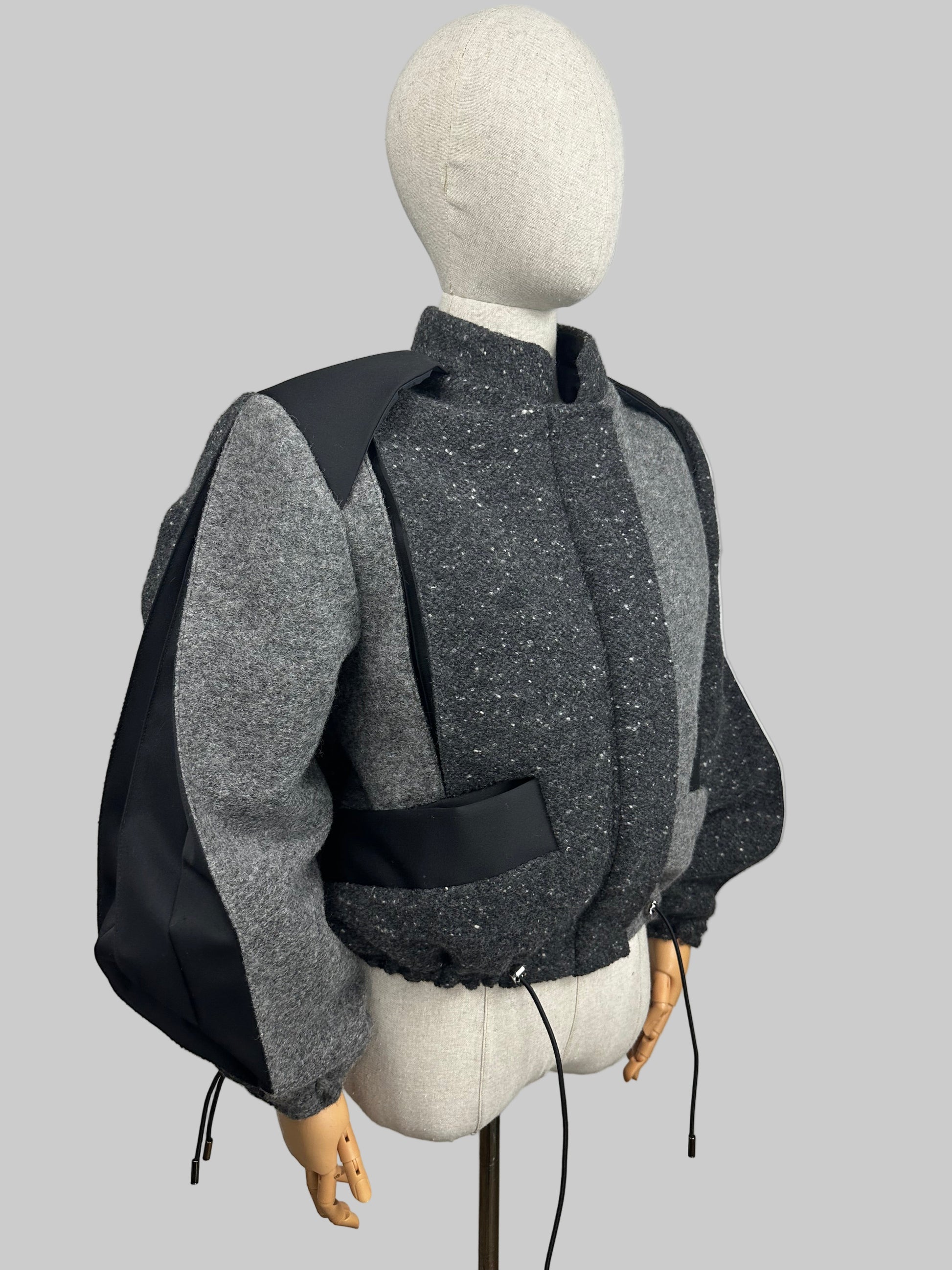 Il Bomber SOVIE rappresenta l'eccellenza della linea Premium AVRÉUSA: un pezzo unico realizzato artigianalmente e rifinito a mano, ispirato all'architettura brutalista e caratterizzato da un sofisticato gioco di contrasti e inversioni tra grigi e nero.